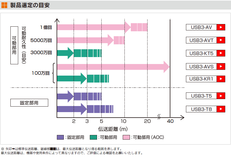 We offer a lineup to meet diverse needs, ranging from types for fixed installation to highly durable types for moving parts, as well as optical transmission types suitable for long-distance transmission.