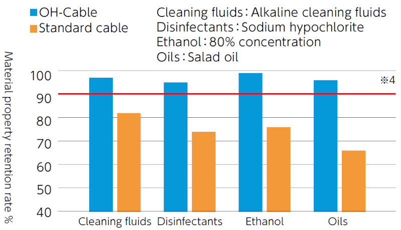 We test changes in material properties (tensile strength and elongation) due to immersion in disinfectants, ethanol, oils, and the cleaning fluids that would be used when cleaning food manufacturing equipment*4. According to our standards, we consider a material property retention rate of 90% or higher after testing to be acceptable. We have therefore confirmed that OH Cables show no deterioration and retain satisfactory values.