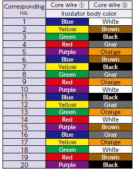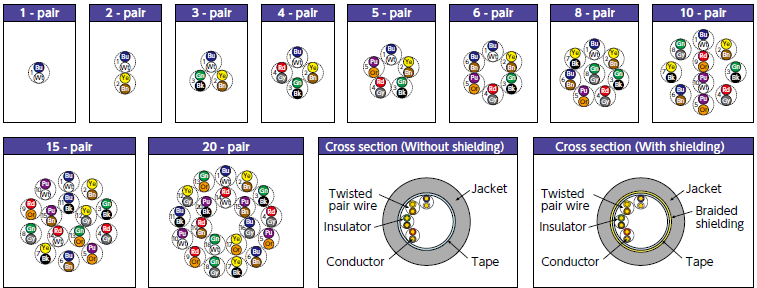 | Without shielding | Cross-sectional area of conductor: 0.2 to 0.5 mm² Number of pairs : 1 to 20 |