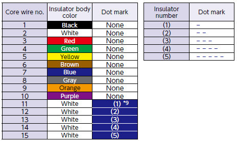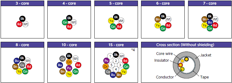 | Without shielding | Cross-sectional area of conductor: 0.05-0.5mm2 Number of cores: 3 to 15 |
