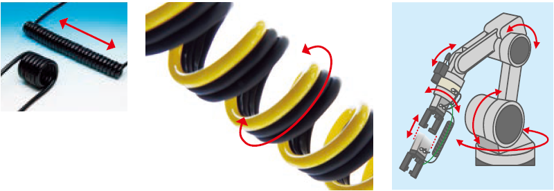 These are cables for moving parts and VEYOR-CABLES formed into a spiral. They are suitable for applications requiring telescopic motion.