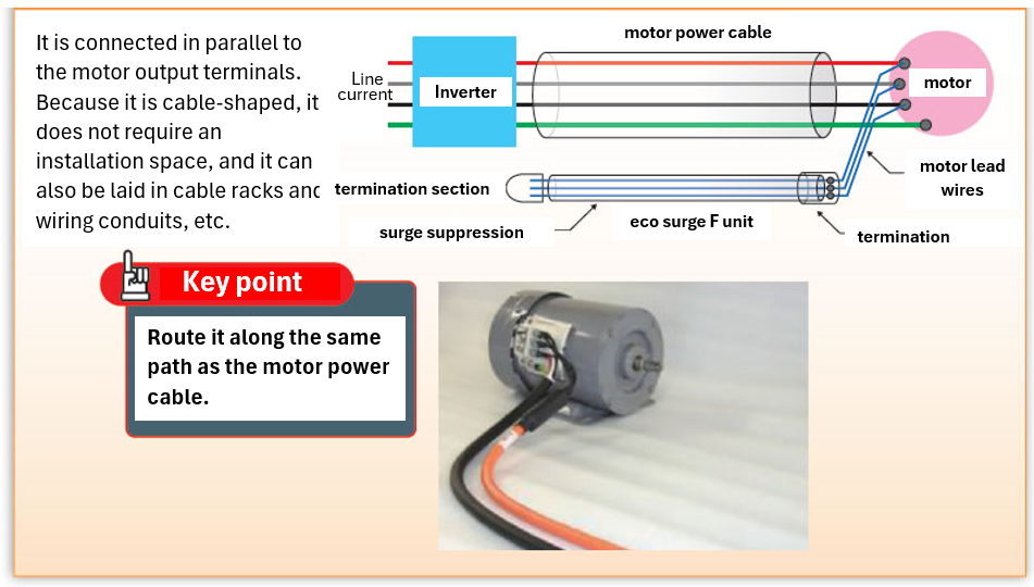 We have integrated the "surge suppression wire" into the cable to create a cable-type product. It can be used not only in newly installed systems but also in existing systems as a replacement for conventional filters and reactors, enabling a significant reduction in installation space. It is suitable for both indoor and outdoor installation environments.