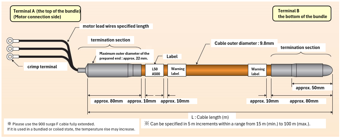 The length of eco surge® F shall be equal to or longer than the power cable length. In addition, the supported power cable length is up to 100 m as standard.