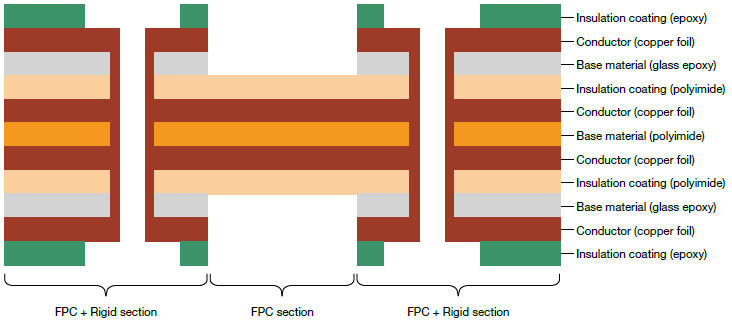This Flex-Rigid has a multilayer structure that integrates the FPC and Rigid boards. Both the bendability and mountability of components are realized at the same time, and the Flex-Rigid can be connected without using connectors.