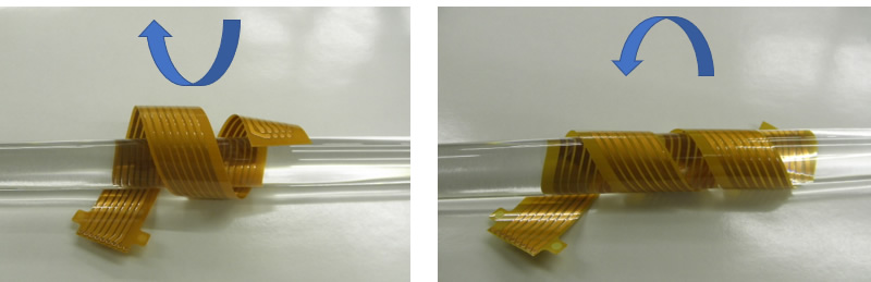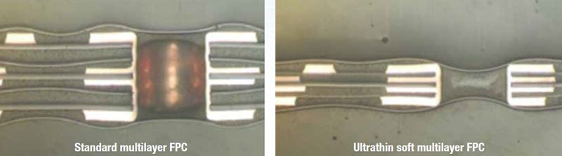 Example of flexibility of four-layer FPC (Left: Standard multilayer FPC/Right: Ultrathin soft multilayer FPC)